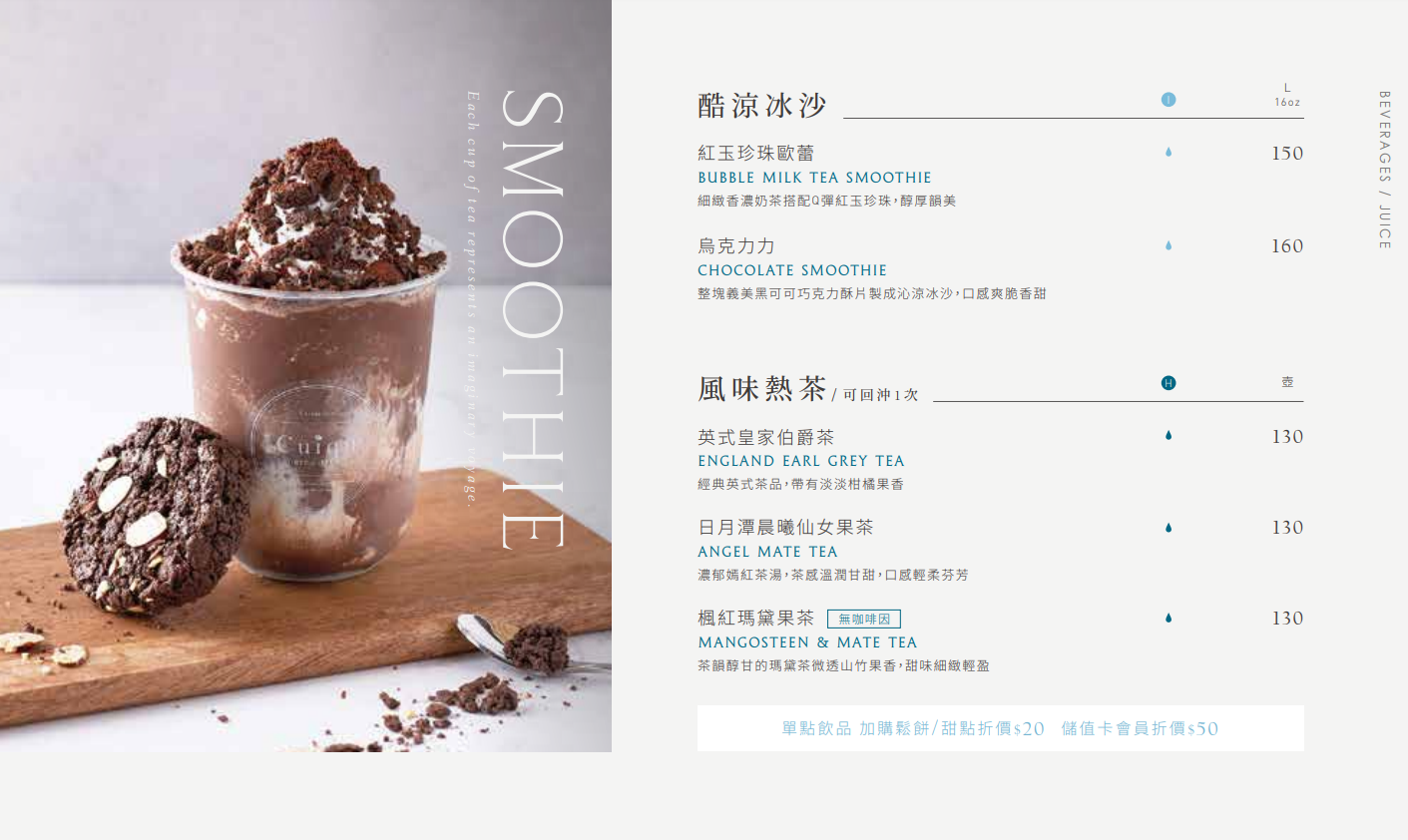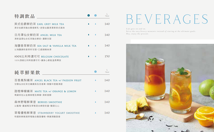 以清香果茶搭配酸甜果肉,茶色飽滿,色澤繽紛;入口沁涼甘醇,回味無窮。