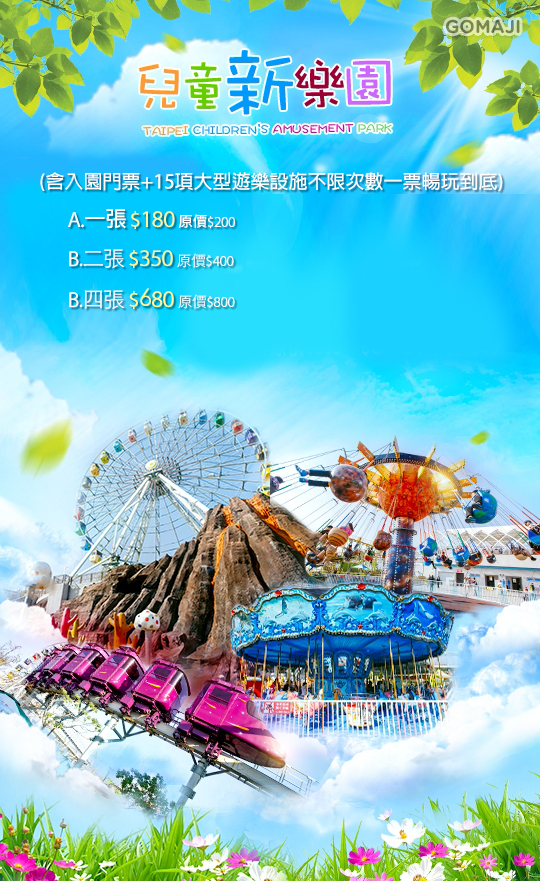 兒童新樂園是一座兼具教育、休閒與文化功能的都會型遊樂園地,榮獲2018年「臺北市觀光遊憩績優景點」優等獎,及穆斯林友善景點認證,也是國內廣告、戲劇、電影拍攝之熱門景點,GOMAJI×結合兒童新樂園推出指定電子一日套票,讓您輕鬆、歡樂、超值遊玩兒童新樂園。